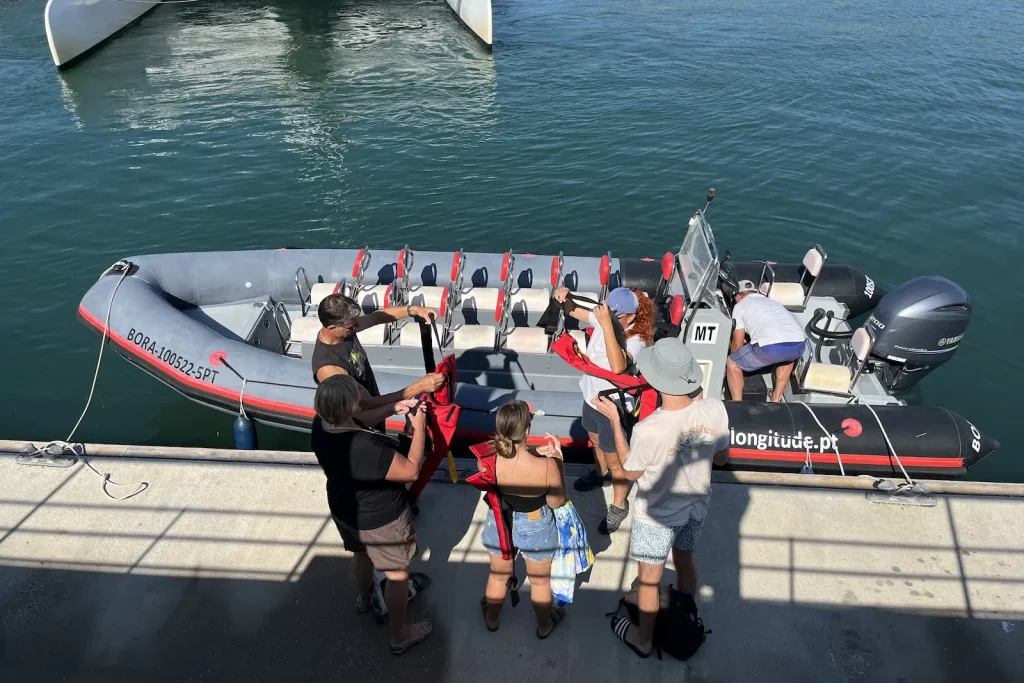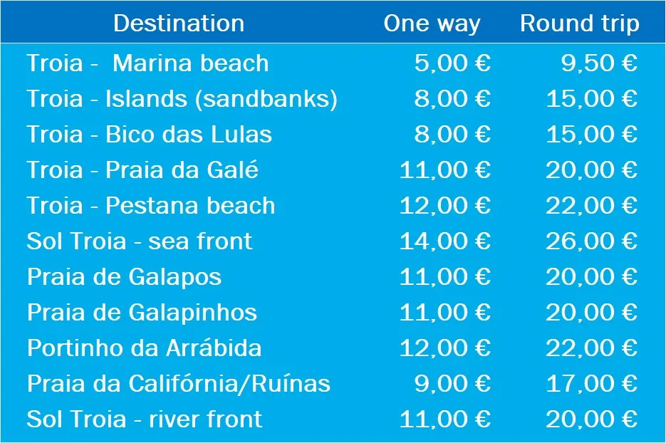 en Setúbal, en el muelle marítimo-turístico (lado sur del Muelle de Pescadores) o en la playa de la Marina de Troia. En caso de embarque en la Marina de Troia, se añadirá la tasa de la marina (25 €). Para el transporte desde las islas u otros destinos, el embarque debe coordinarse con la tripulación.